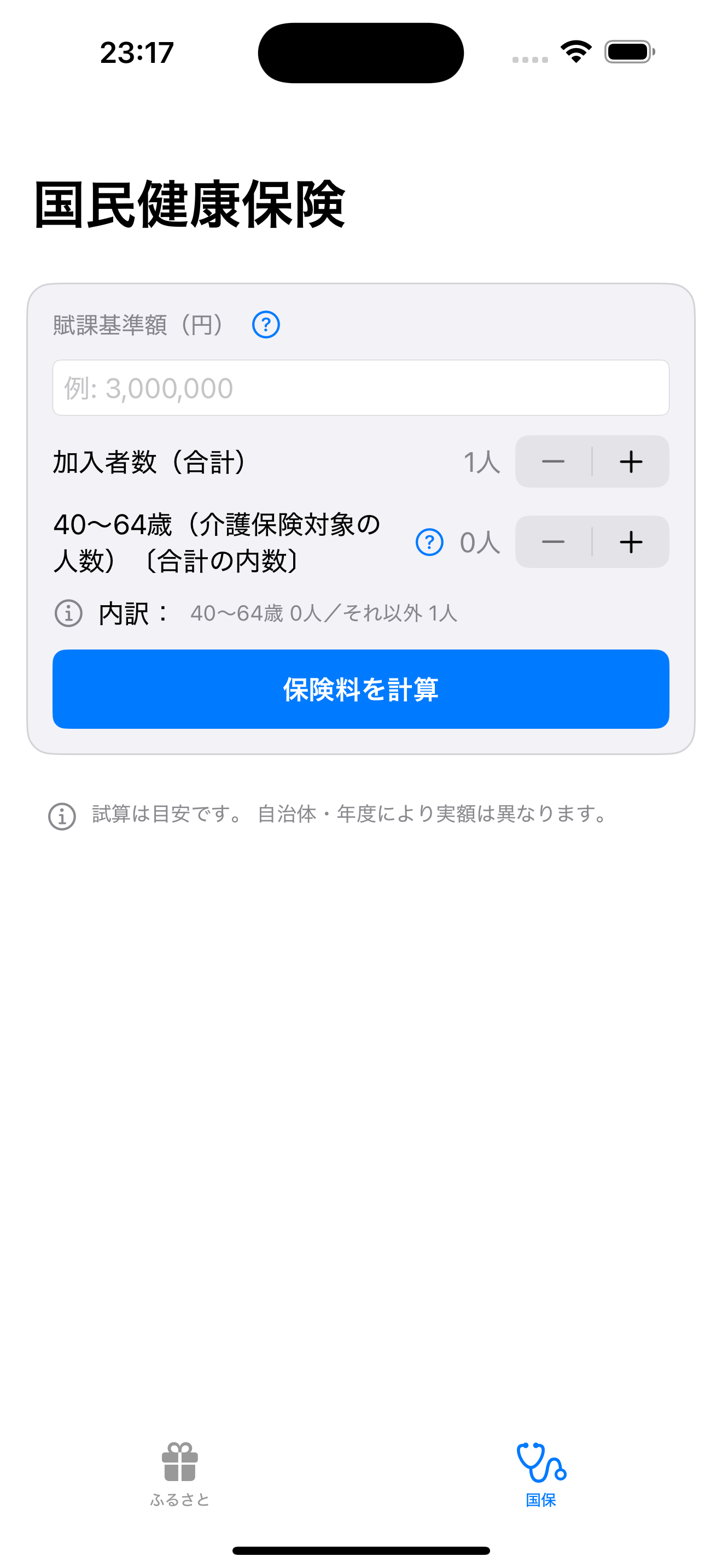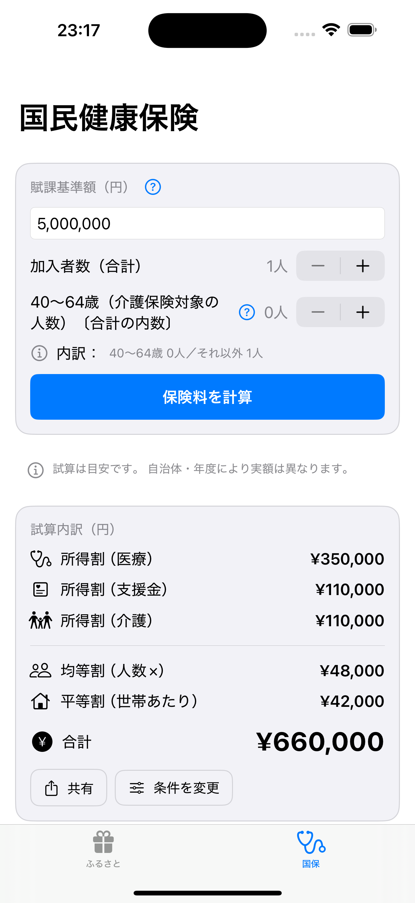 4. 「保険料を計算」→ 内訳(所得割/均等割/平等割)と合計を確認・共有